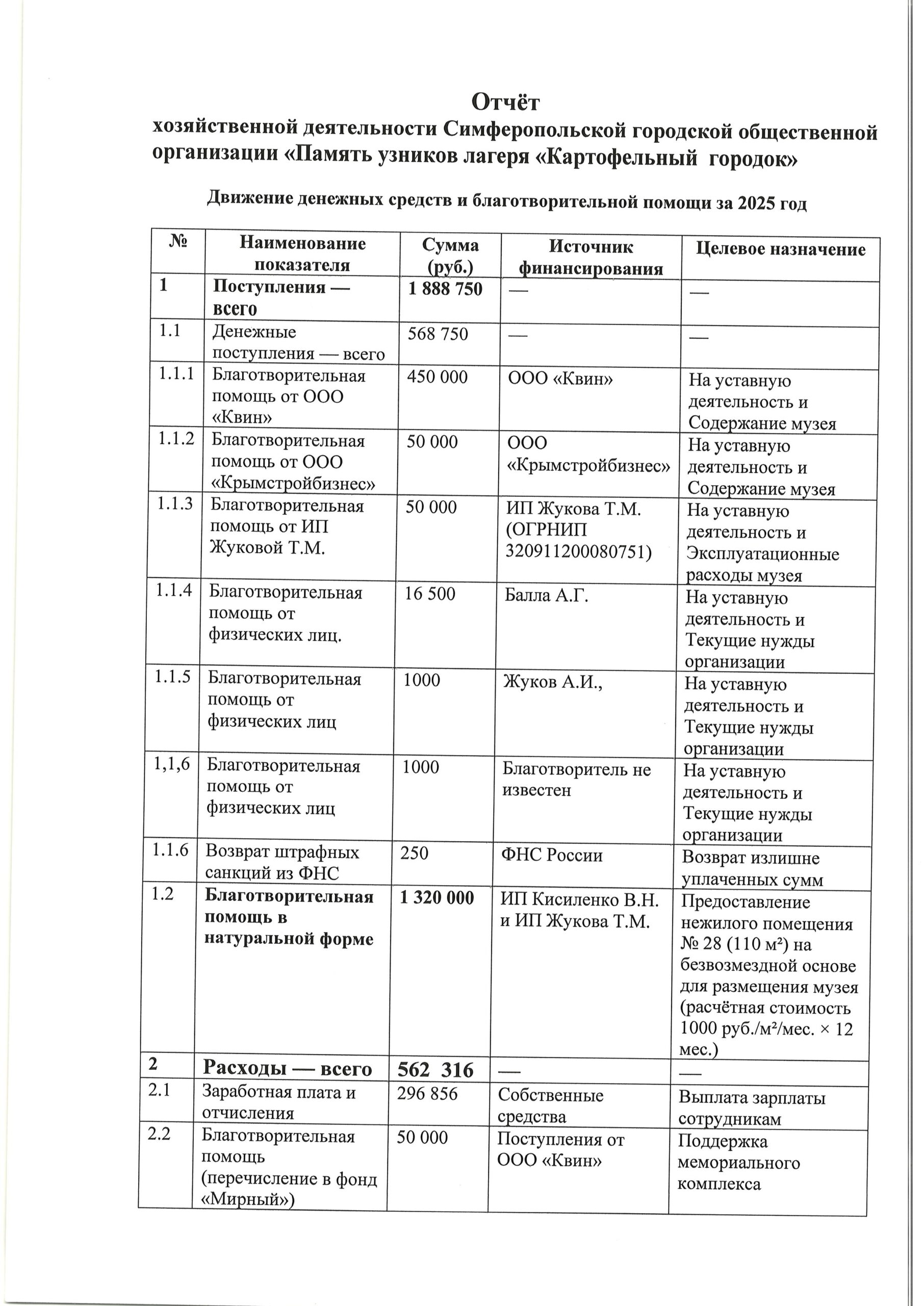 Отчёт хозяйственной деятельности Симферопольской городской общественной организации «Память узников лагеря «Картофельный городок»
