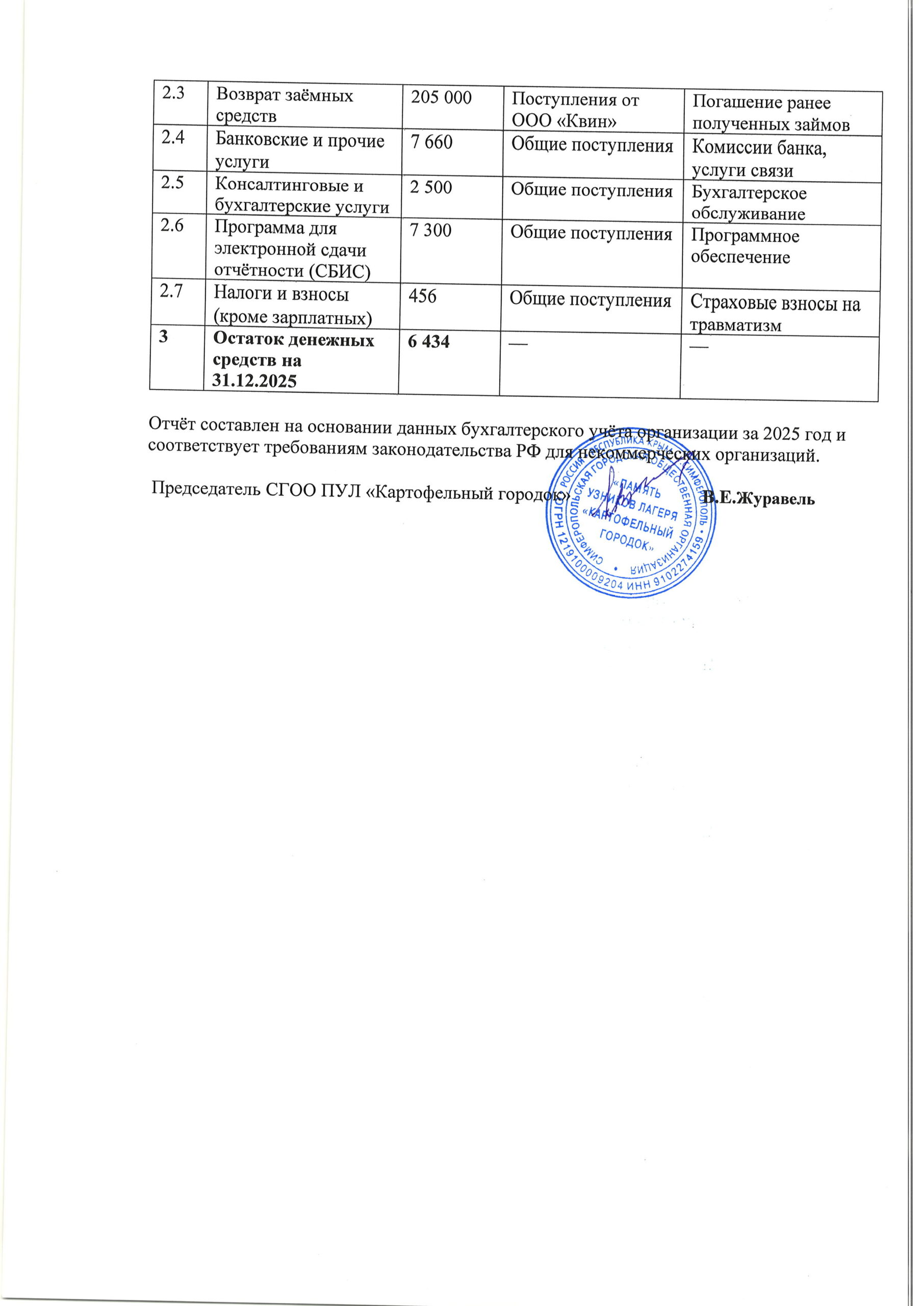 Отчёт составлен на основании данных бухгалтерского учёта организации за 2025 год и соответствует требованиям законодательства РФ для некоммерческих организаций.
