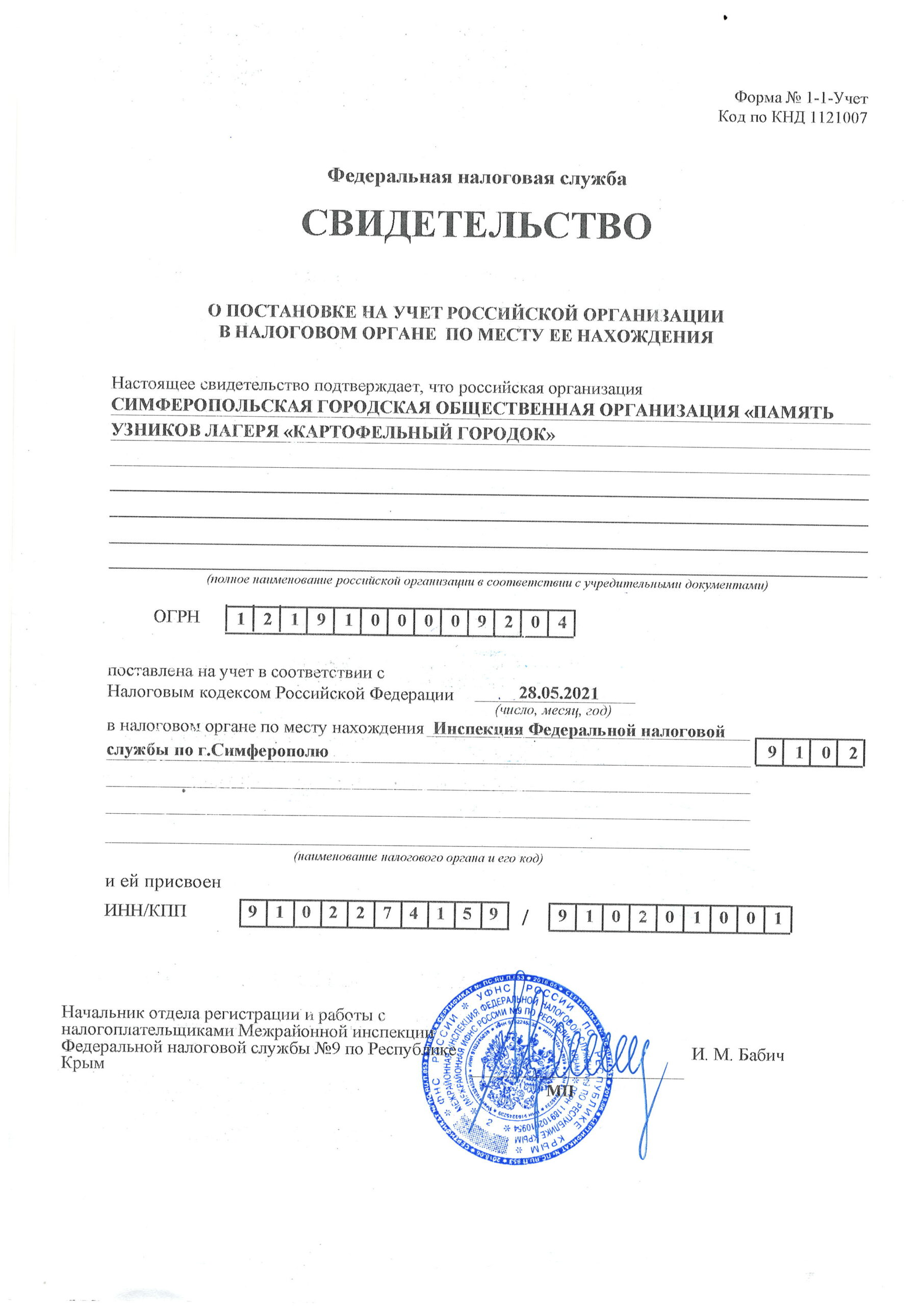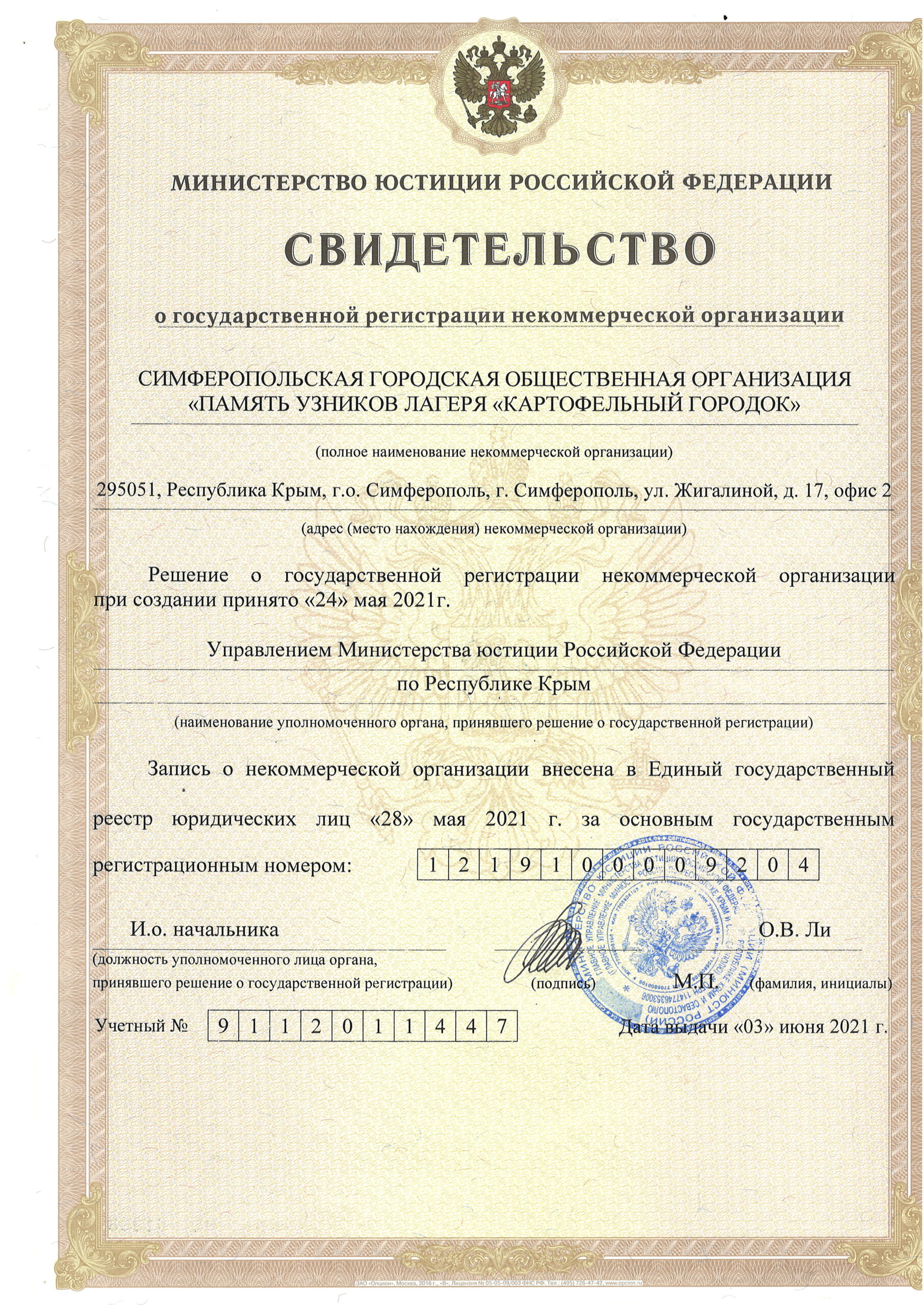 Симферопольская городская общественная организация (СГОО) «Память узников лагеря “Картофельный городок”» зарегистрирована 28 мая 2021 года в Министерстве юстиции Российской Федерации.