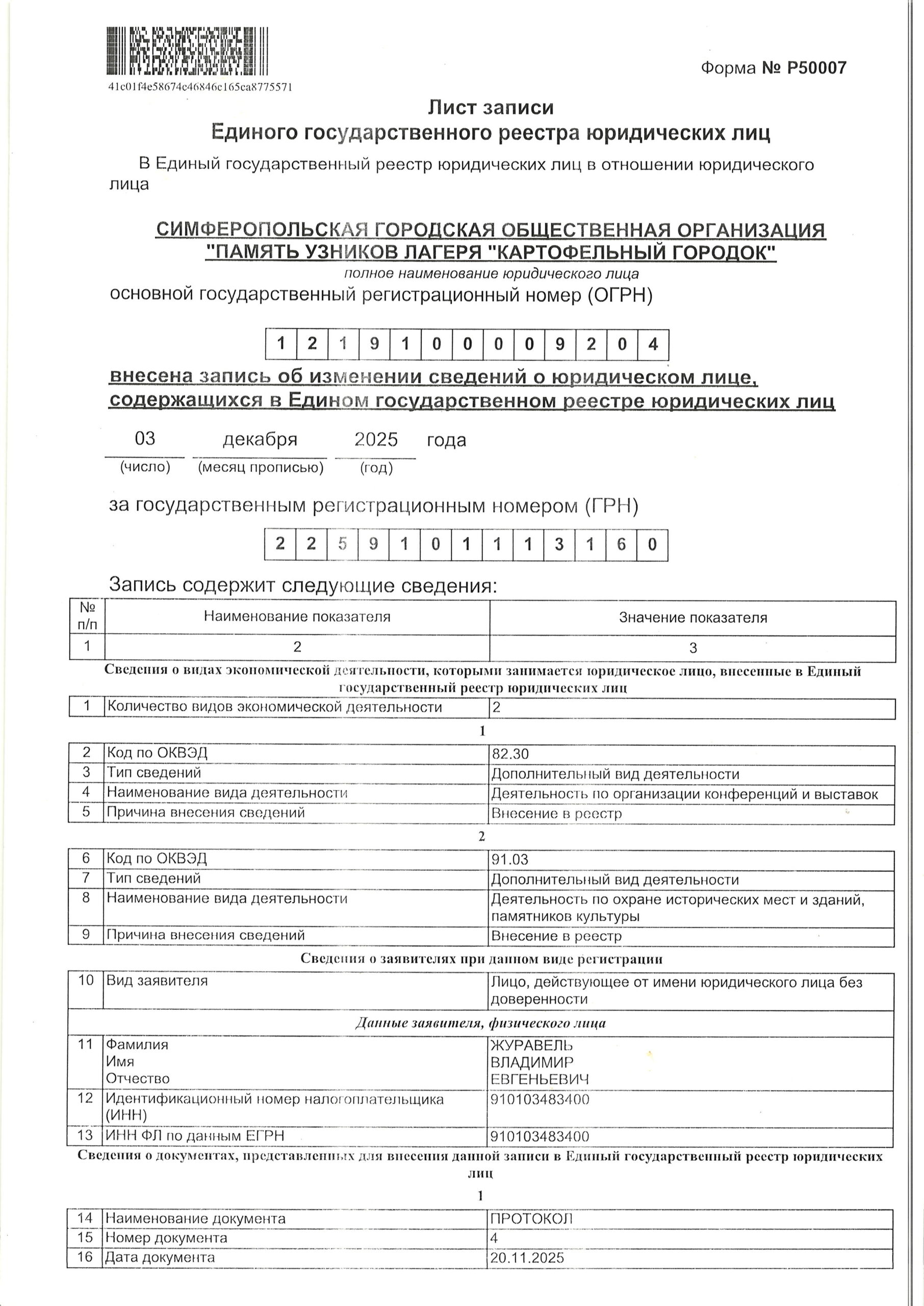 | 1.1.3 | Благотворительная помощь от ИП Жуковой Т.М. | 50 000 | ИП Жукова Т.М. (ОГРНИП 320911200080751) | На уставную деятельность и Эксплуатационные расходы музея |
